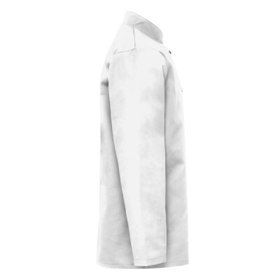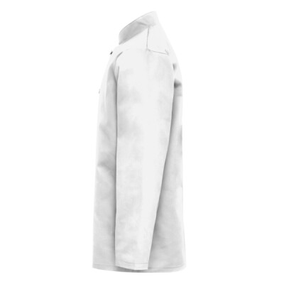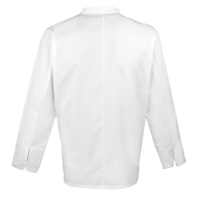 Long sleeve chef’s jacket. Superior overall comfort. Soft hand feel. Mandarin Collar stand with topstitching. Removable studs. Unisex styling. Comes with black studs (other colours available see PR652) 60 degrees domestic wash. 10 hole wrap over fastening. Turn back split cuff.